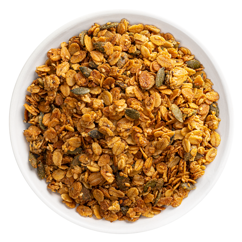 Ingredientes: copos de avena integrales sin gluten*, (45,8%), mezcla de semillas* (19,6%) (semillas de calabaza*, lino dorado*, sésamo*, girasol* y chía*), sirope de agave*, tahin* (semillas de sésamo tostado*), aceite de coco* y fibra de tapioca*.