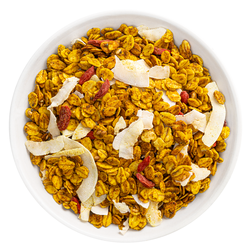 Ingredientes: copos de avena integrales sin gluten*, (58,4%), sirope de agave*, aceite de oliva virgen extra*, tahin* (semillas de sésamo tostado*), fibra de tapioca*, coco tostado* (2,8%), semillas de chía* (2,1%), semillas de lino*, bayas de goji deshidratadas* (1,9%), cúrcuma* (1,3%), canela* y jengibre* (0,2%).